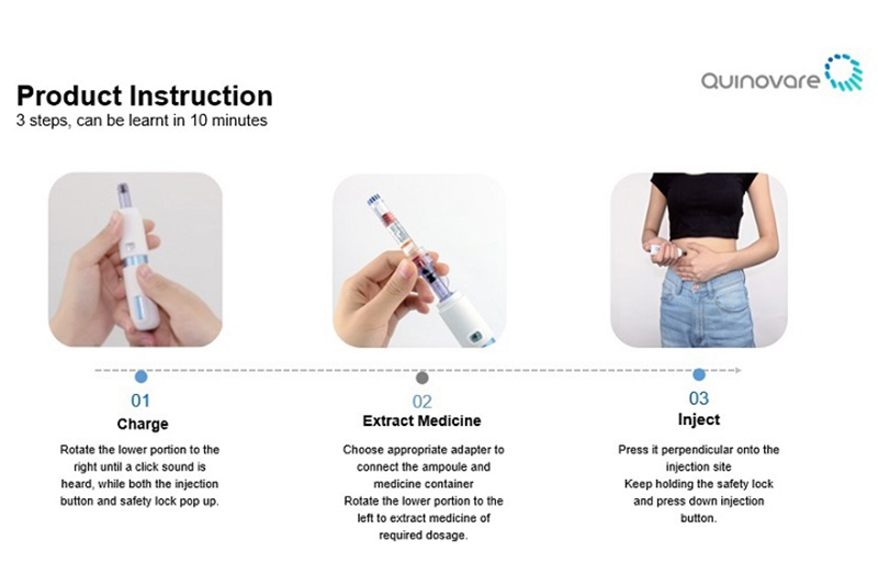 Nálarlausi sprautubúnaðurinn QS-P er hannaður til að sprauta lyfjum undir húð, svo sem insúlíni, vaxtarhormóni, staðdeyfilyfjum og bóluefnum. Nú hefur QS-P verið samþykkt til inndælingar á insúlíni og vaxtarhormónum í Kína. Nálarlausi sprautubúnaðurinn QS-P er fjaðurknúinn tæki sem notar mikinn þrýsting til að losa fljótandi lyf úr öropi til að búa til örfína vökvastraum sem fer samstundis inn í undirhúðina.